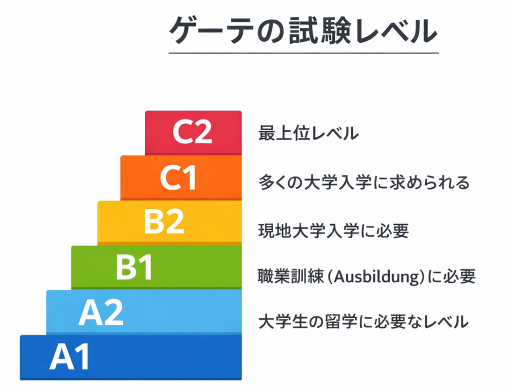 ゲーテの試験は下からA1、A2、B1、B2、C1、C2の6つのレベルがあり、C2が最高です。